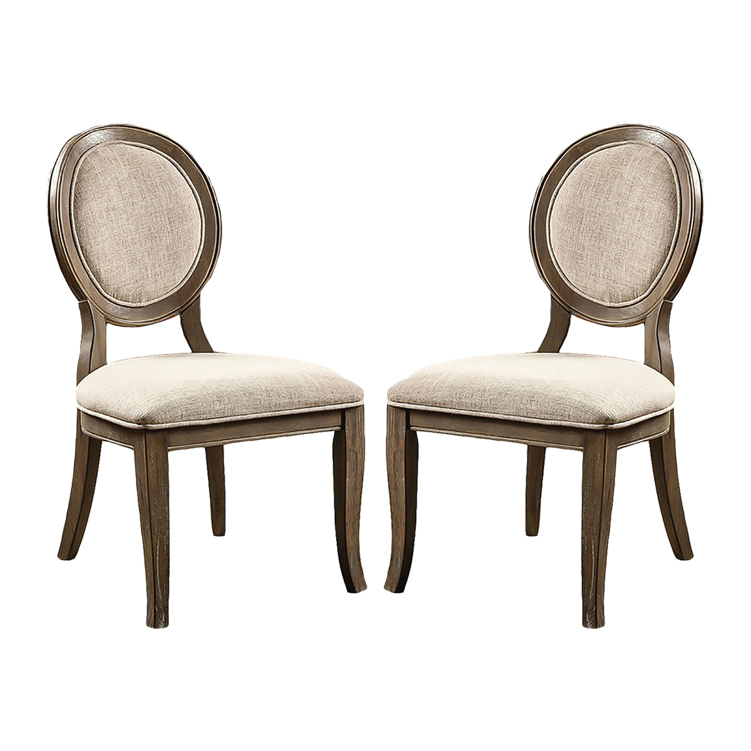 The oval shape back design chair feature beige fabric seat cushions which can provide the comfort you desire. This chair showcases a stunning appearance and eye catching design. Sold in a convenient set of two.