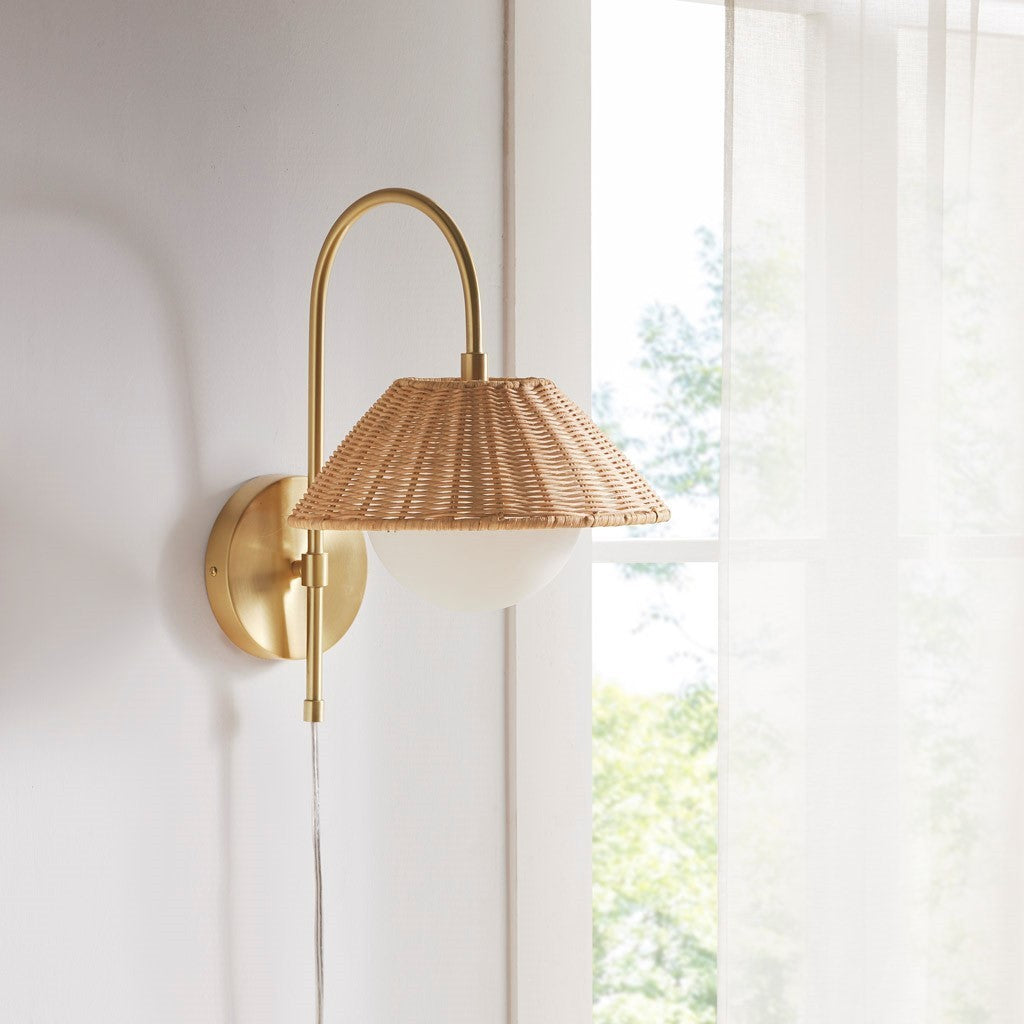 Introducing the Laguna rattan weave wall sconce from Ink+Ivy - a versatile and stylish lighting solution that will complement any decor. Made from durable iron in a modern gold finish, this sconce features a natural rattan shade paired with a frosted globe for a warm and inviting glow. Easy to install with a plug-in, 60 inch clear colored cord, this sconce requires one type B bulb (not included). Perfect for indoor use, the Laguna rattan weave wall sconce is the ideal choice for creating a cozy and romantic ambiance in any space.