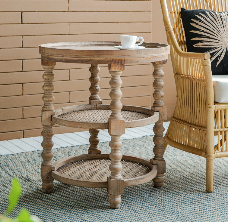 With its round, three-tiered silhouette, warm toffee brown finish, and two woven rattan shelves, this decorative side table will infuse your home decor with a classic style. Supported by turned legs, this piece showcases a truly unique silhouette that is sure to turn the heads of your guests whether it is placed in your living room, entryway, or bedroom.