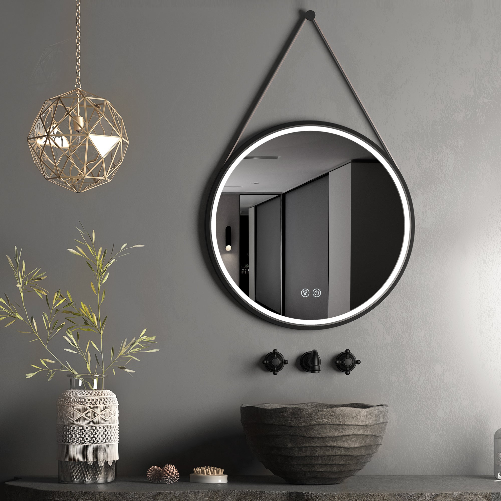 ①√Exquisite workmanship: Our 28*28 inch hanging bathroom mirror is made of high-definition environmentally friendly copper-free silver glass, with a 1.6-inch black metal frame and high-quality PU belt, which can enhance the sense of fashion and stability.