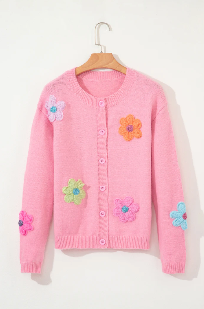 This cardigan combines a delicate floral design with a cozy rib-knit fabric, perfect for adding a touch of charm to your wardrobe.