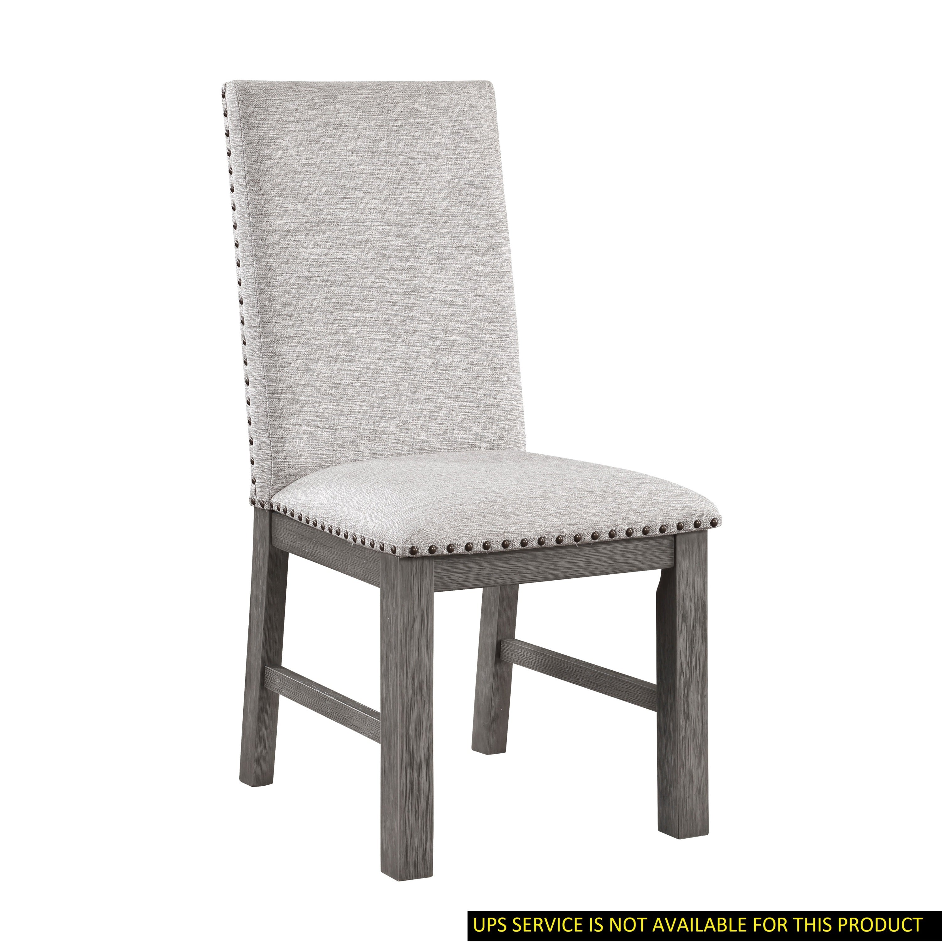 PRODUCT DESCRIPTION: At the intersection of modern and rustic design, the Gresham Collection brings you to a full stop. Clean lines are paired with the natural beauty of acacia veneer, while a gray finish lends neutral versatility to the décor of your casual dining room. The side chair features wood legs and beige fabric upholstered seats, with profile-defining nailhead trim.