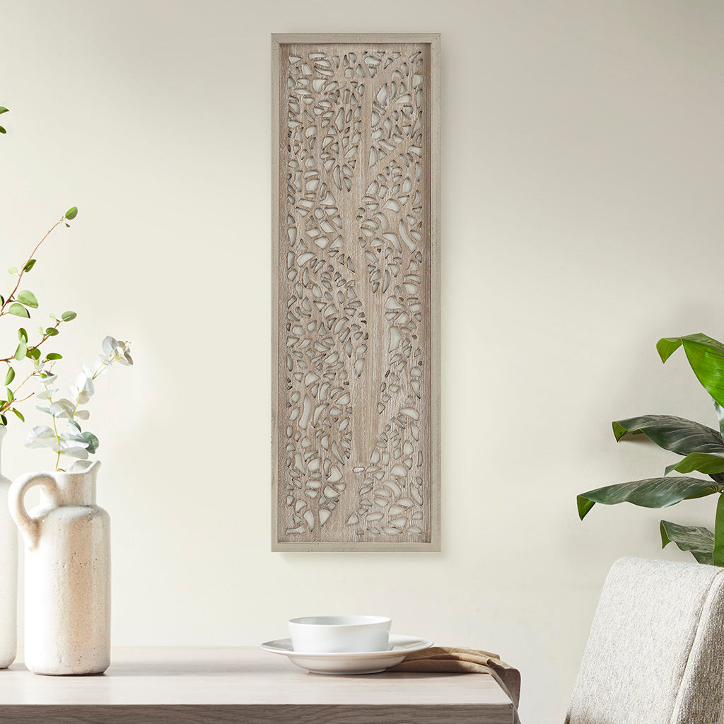 Revive your home with our Laurel Branches Laser Cut Tree Framed Panel Wall Decor by Artist Emily Warne. This alternative wall art features a laser-cut MDF botanical branch design in a natural tone for a rustic and stylish touch, while the 100% fir wood frame adds a natural and modern update. Measuring 12x36" and featuring 4 D-rings on the reverse, easily hang this piece both vertically or horizontally for a beautiful botanical addition to any room or decor. |