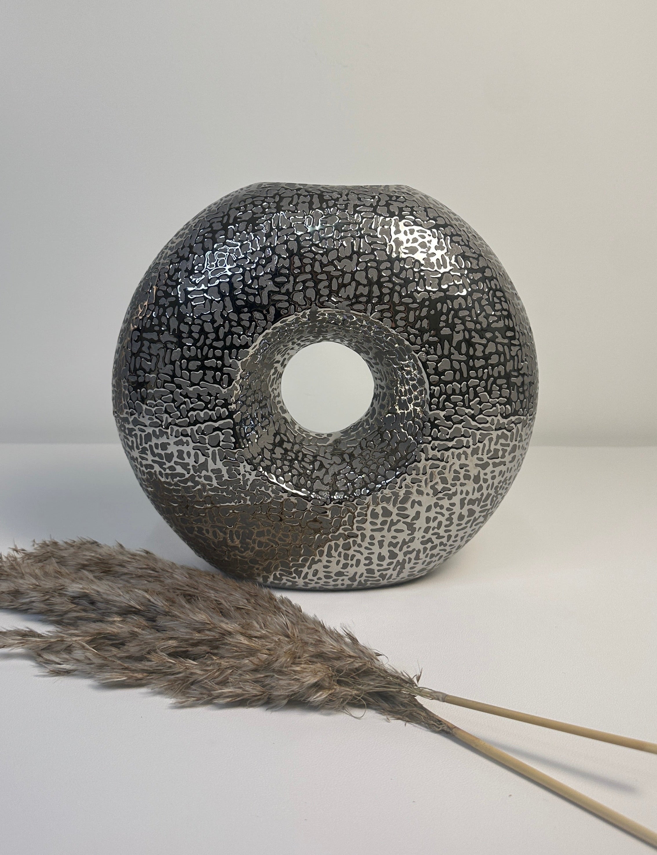 Introducing the Modern Donut Silver vase, a sleek and stylish addition to any home decor. With a height of 10 inches, this vase is the perfect size for displaying your favorite flowers or adding a touch of elegance to any room. Crafted with high quality materials, this vase is sure to impress with its modern design.