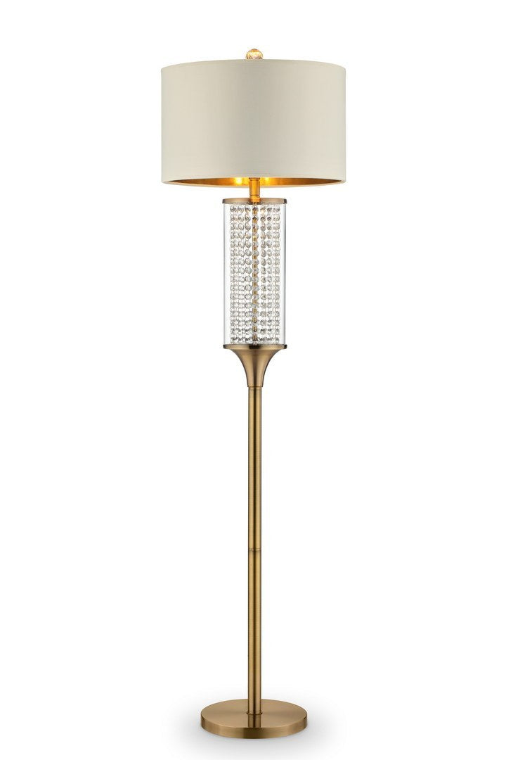 Elegant yet understated, this Crystal Pluviam floor lamp is sure to please. The perfect addition to modern decor, this crystal floor lamp features a cylindrical glass drum w/ stacked imported crystal beading strands cascading like waterfall to a crisp off-white linen shade w/ matte gold lining for a dramatic effect and creates a stunning and clean appeal. Sleek and stylish, this crystal column drum floor lamp is a living room or bedroom essential. Matte gold finish steel accents elegantly play up its chic, crystals and glass body, giving it a truly sophisticated look. Ideal for beside a reading chair or bedside, its off-white drum shade w/ matte gold lining creates the perfect amount of light for leisurely evenings at home. Add some glam to your decor with this wonderful accent light. Update any space instantly by adding this glam crystal glass floor lamp. Materials: Glass, Metal, Solid imported Crystal Strands, Cotton/Linen.